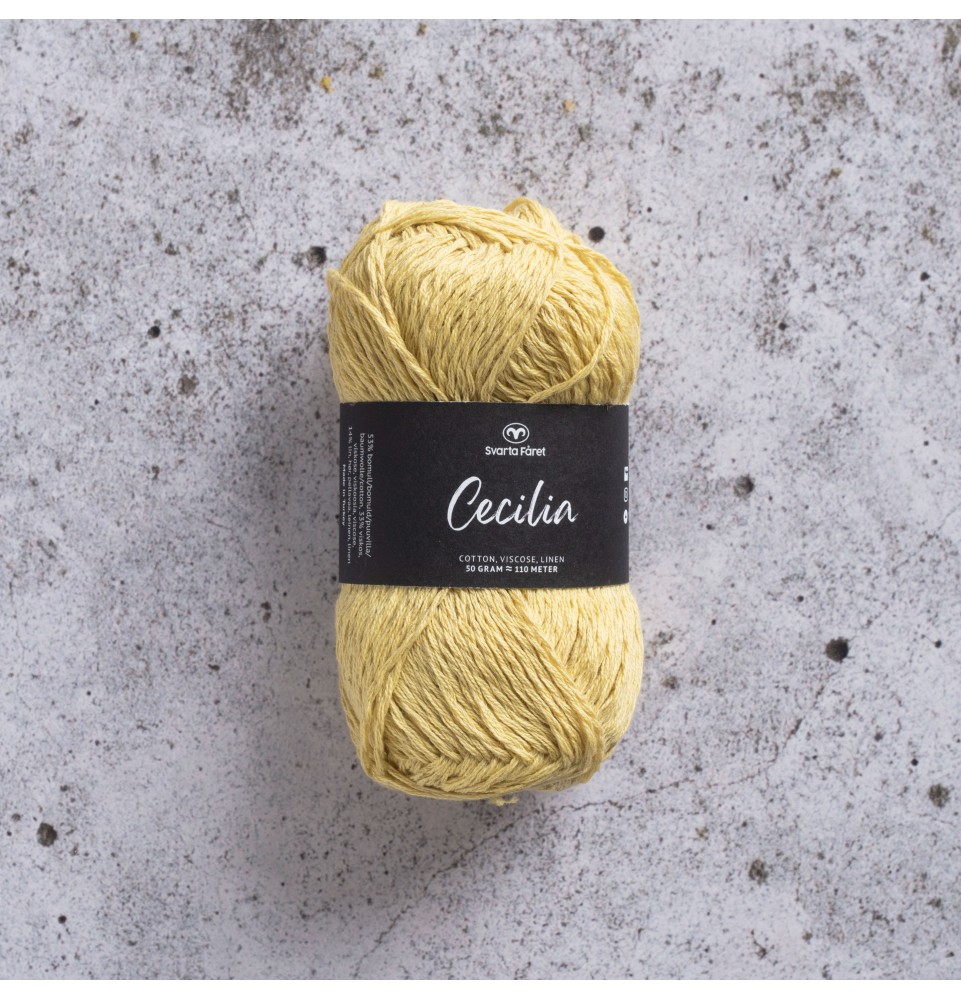 Cecilia kommer i en härlig blandning av 53% bomull, 33% viskos och 14% lin. Garnet har en vacker struktur och passar perfekt till lätta och luftiga plagg för våren och sommaren. Garnet är upplagt på 50 grams nystan om 110 meter, och stickfastheten 21 maskor på stickor nr 4 ger 10 cm. Plagg som stickas med Cecilia tvättas i 30 graders maskintvätt. Med närmare 30 färger att välja bland är det bara kreativiteten som sätter gränser för vad du kan skapa med detta garn.