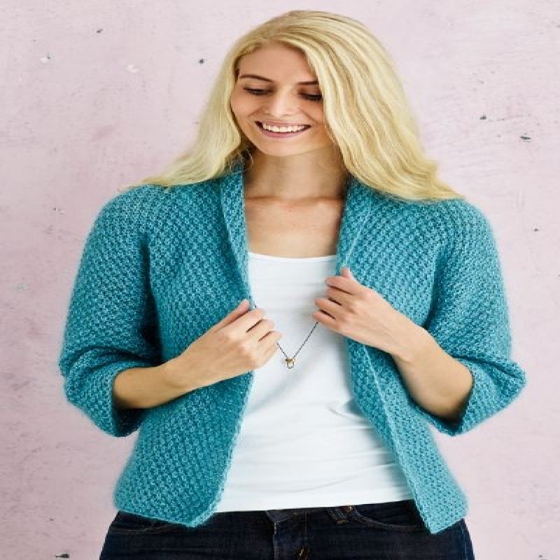 Hela jackan stickas i dubbelt garn och stickas i ett stycke