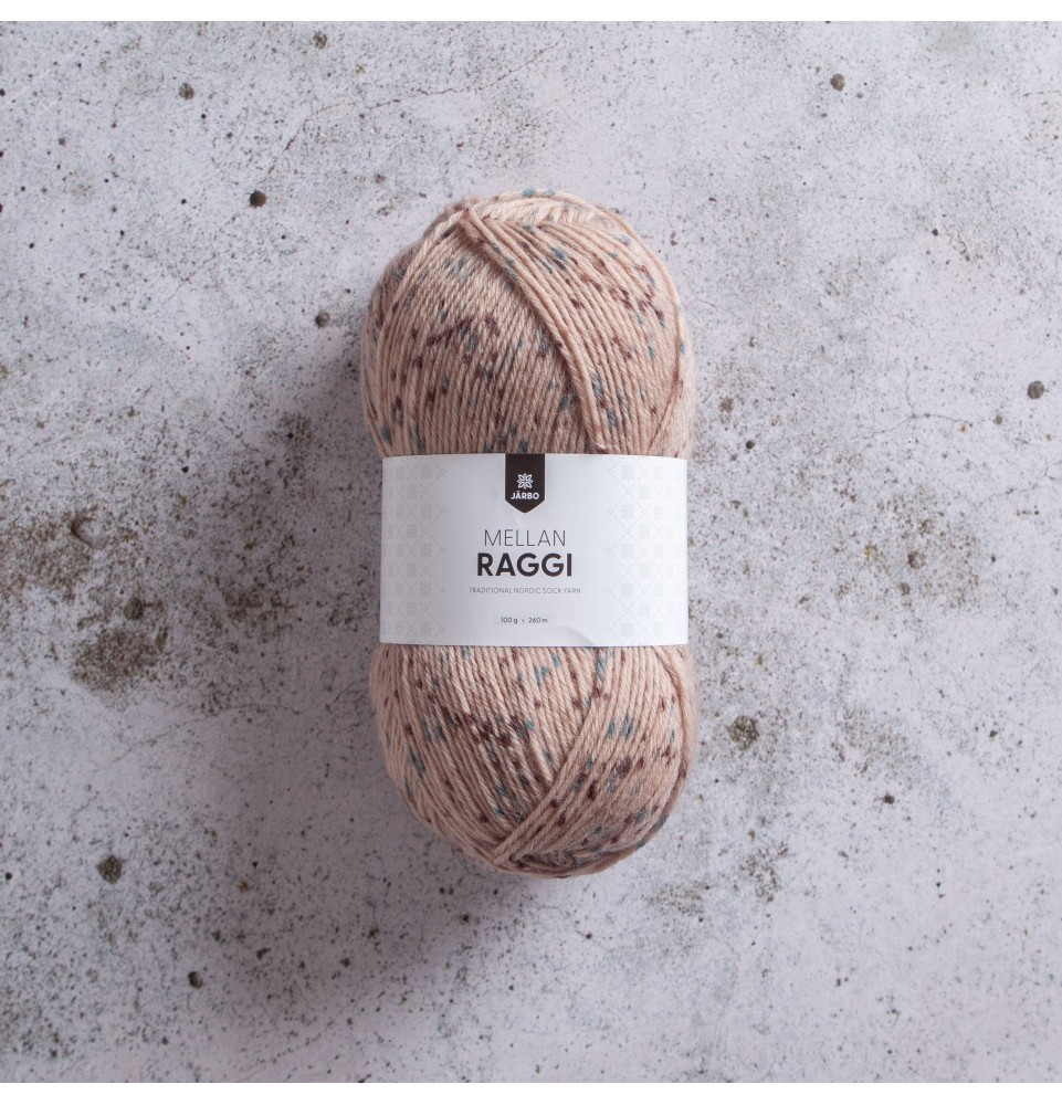 Raggi är sockgarnernas urfader och Järbos stolthet. Mellanraggi är ”mellanbarnet” i Raggi-familjen! Precis som i den tjockare Raggi innehåller Mellanraggi en mix av superwashbehandlad ull och polyamid gör garnet slitstarkt och tåligt. Därför passar det särskilt bra till sockor. Raggifamiljen består av ett helt gäng garner, alla särskilt framtagna för att passa till sockstickning men även andra typer av plagg.