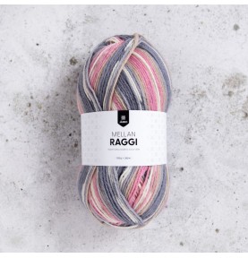Raggi är sockgarnernas urfader och Järbos stolthet. Mellanraggi är ”mellanbarnet” i Raggi-familjen! Precis som i den tjockare Raggi innehåller Mellanraggi en mix av superwashbehandlad ull och polyamid gör garnet slitstarkt och tåligt. Därför passar det särskilt bra till sockor. Raggifamiljen består av ett helt gäng garner, alla särskilt framtagna för att passa till sockstickning men även andra typer av plagg.