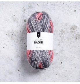 Raggi är sockgarnernas urfader och Järbos stolthet. Mellanraggi är ”mellanbarnet” i Raggi-familjen! Precis som i den tjockare Raggi innehåller Mellanraggi en mix av superwashbehandlad ull och polyamid gör garnet slitstarkt och tåligt. Därför passar det särskilt bra till sockor. Raggifamiljen består av ett helt gäng garner, alla särskilt framtagna för att passa till sockstickning men även andra typer av plagg.