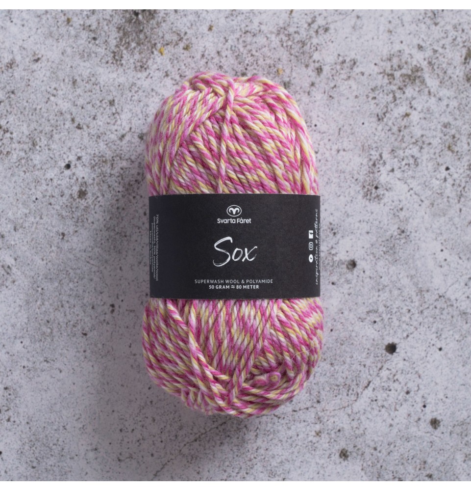 Sox är ett klassiskt sockgarn i en slitstark och värmande blandning av 70% ull och 30% polyamid. Precis som namnet indikerar är detta det perfekta garnet när du vill sticka sköna sockor till hela familjen. Garnet är upplagt på 50 grams nystan om 80 meter, och för att sticka ett par sockor i damstorlek går det åt ca 3 nystan. Stickfastheten 16 maskor på stickor nr 5.5 ger 10 cm. Plagg som stickas med Sox tvättas i 40 graders maskintvätt. Med flera härliga färger att välja bland kan vi nästan lova att du hittar en kulör som passar din stil.